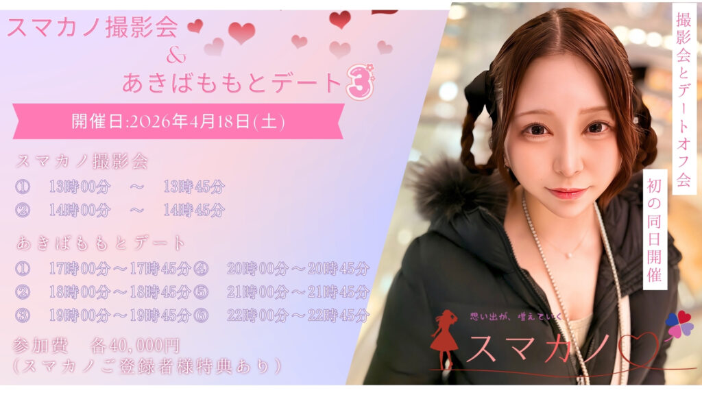 あきばももさんと撮影会と、大好評の1対1、ワインバルデートオフ会の同日開催が決まりました。撮影会は屋外で45分間、デート気分でお楽しみいただけます。デートオフ会も45分間、飲みながら、食べながらふたりきりでお過ごしいただけます。時間内、お写真の撮影やサインも可能です。
