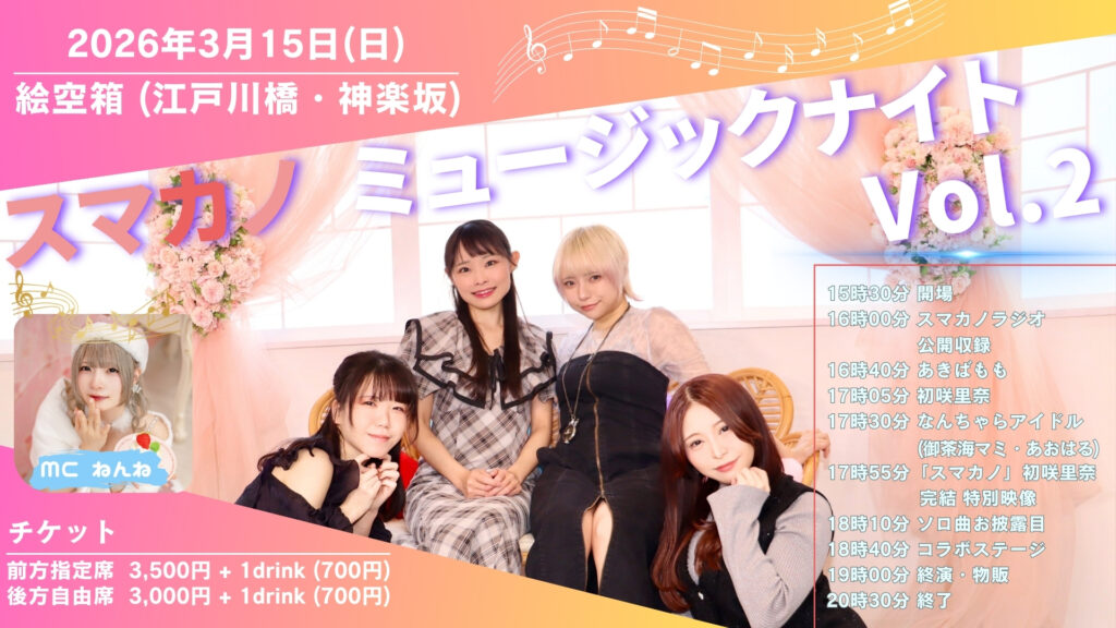 「スマカノ」音楽イベントの第2弾を開催いたします。前回に続きメンバー個々のステージに加え、「スマカノラジオ」の公開収録も。昨年初披露した4人で歌うテーマソング、『想い出が増えていく』ももちろんお聴きいただけます。